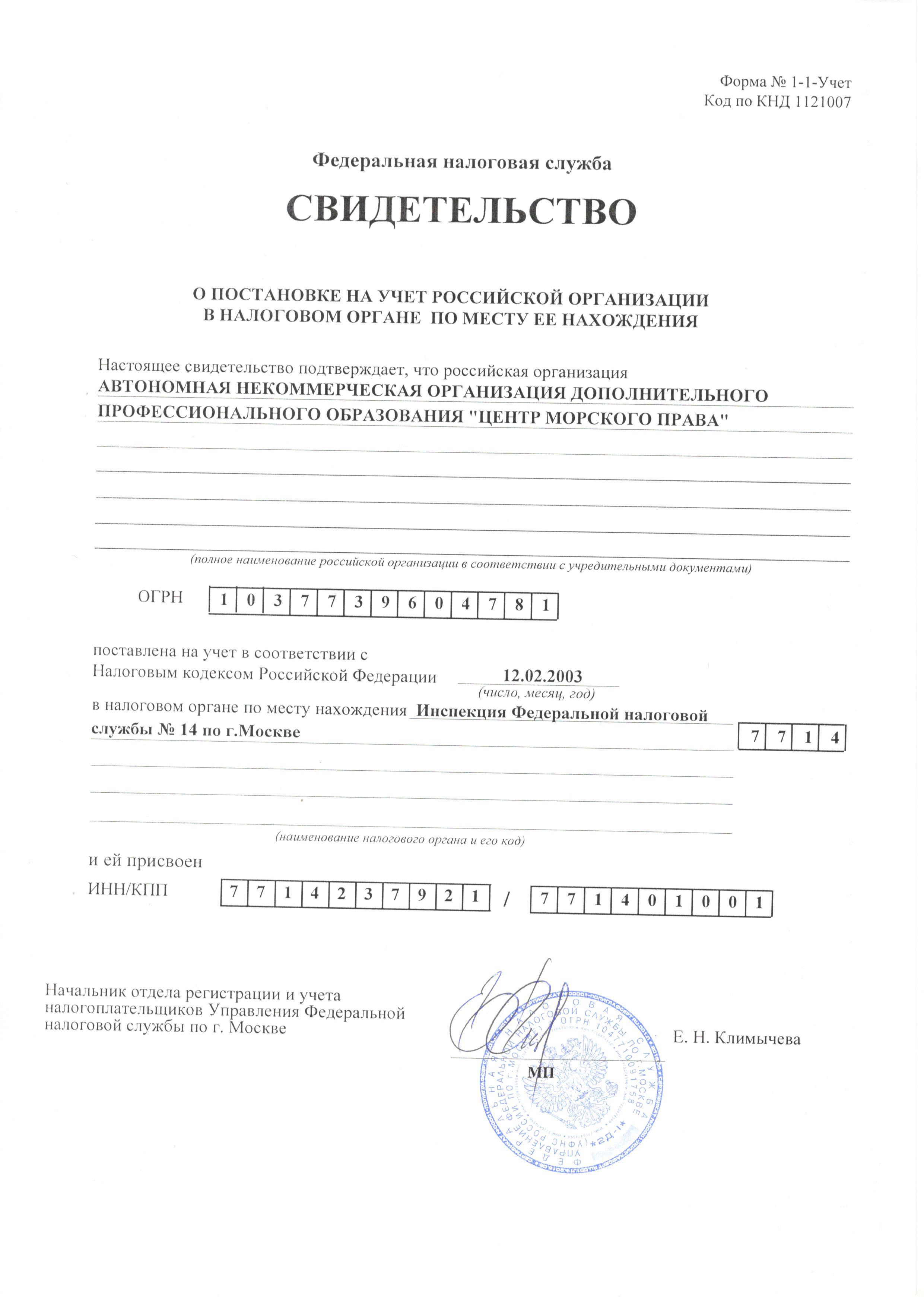 Свидетельство о постановке на учет российской организации в налоговом органе по месту нахождения на территории Российской Федерации
