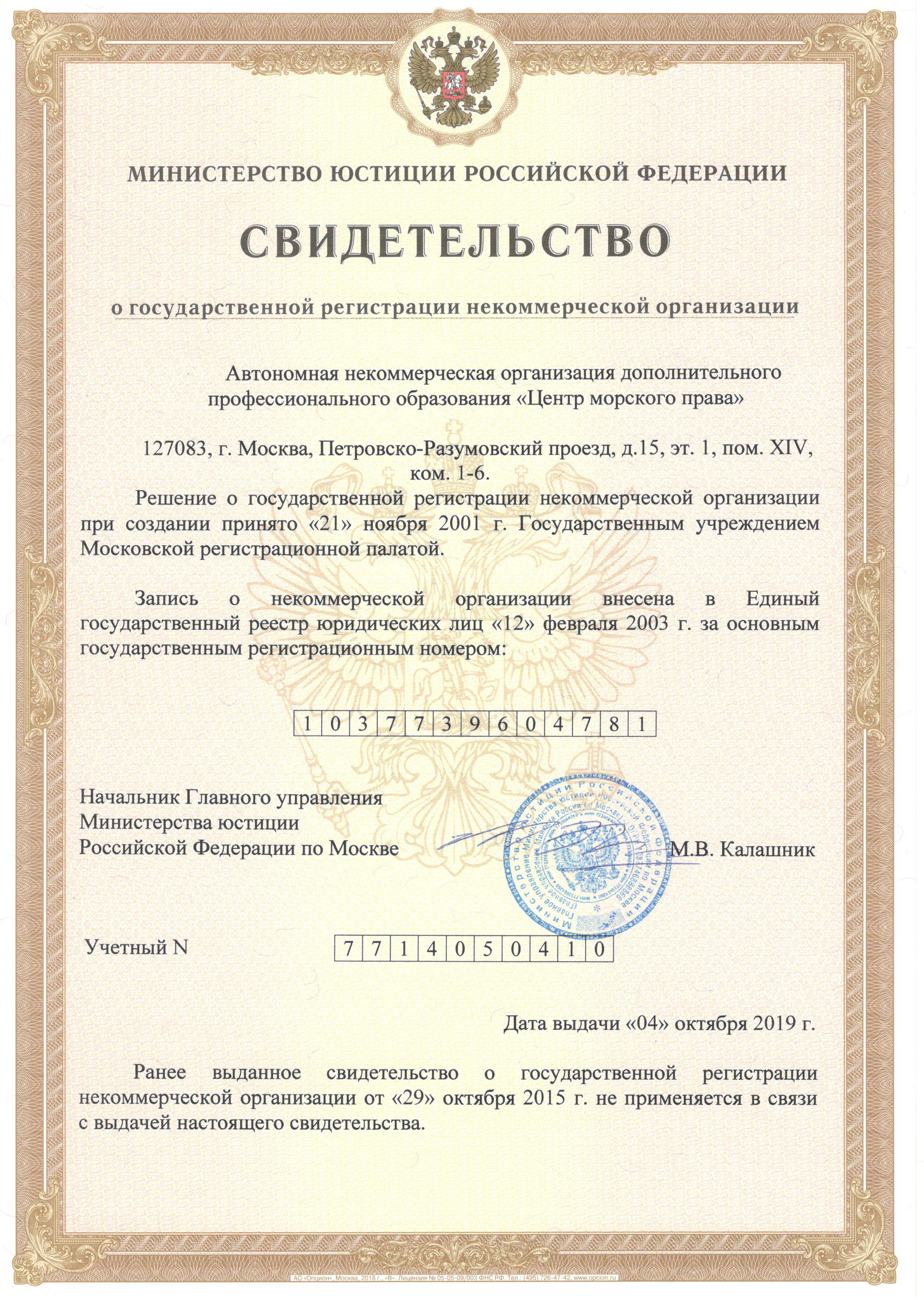 Свидетельство о государственной регистрации некоммерческой организации